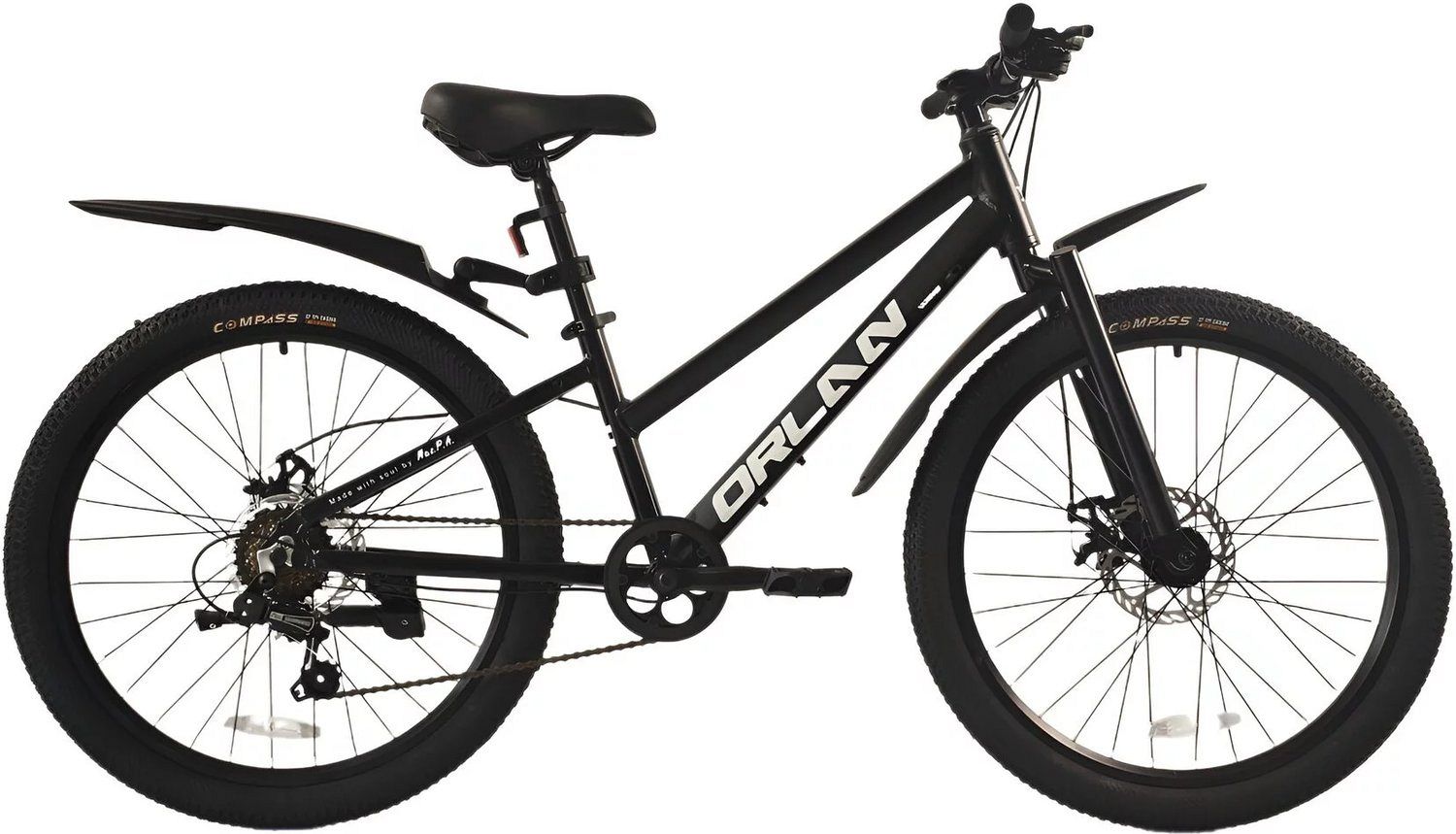 Двойные алюминиевые обода и втулки на промподшипниках гарантируют долговечность и устойчивость колёс. Дисковые механические тормоза работают надёжно и эффективно в любых погодных условиях. Широкие покрышки Compass 24"х2.3 способствуют отличному сцеплению с дорогой и дополнительной амортизации.