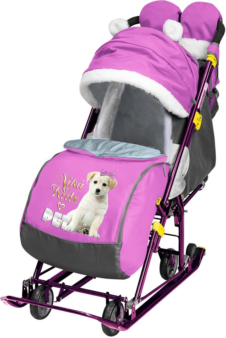 - В комплекте санок-коляски идут сумка и теплые рукавички для удобства использования.